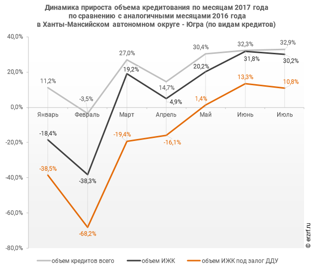 Рост объема ипотечных кредитов для долевого строительства на 10,8% в июле 2017 г. по сравнению с июлем 2016 г. сопровождался ростом объема всех видов кредитов на 32,9% (14,6 против 11,0 млрд. руб. годом ранее), а также ростом всех видов ипотечных жилищных кредитов на 30,2% (4,0 против 3,0 млрд. руб. годом ранее).