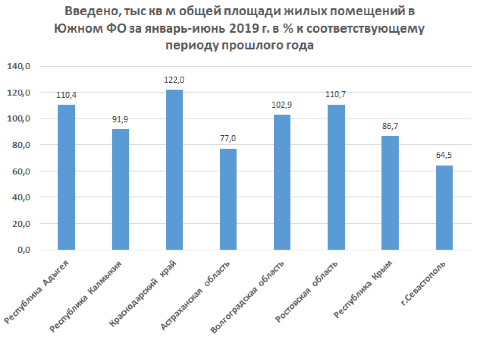 По сравнению с соответствующим периодом 2018 года объемы ввода жилья в Краснодарском крае на 22,0%, Ростовской области – на 10,7%, Республике Адыгея увеличились – на 10,4%, Волгоградской области – на 2,9%.