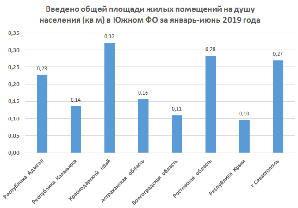 По итогам шести месяцев 2019 года один из самых главных показателей, ввод жилья на душу населения, в ЮФО составил 0,24 кв. метров, что выше среднего показателя в целом по РФ.