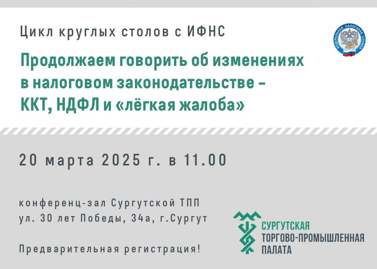 Сургутская Торгово-промышленная палата г. Сургута совместно с ИФНС России по г. Сургуту Ханты-Мансийского автономного округа – Югры приглашает Вас на круглый стол, который состоится 20 марта 2025 года в 11:00 (по местному времени) на площадке Торгово-промышленной палаты г. Сургута по адресу: г. Сургут, ул. 30 лет Победы 34А, 3 этаж, конференц-зал, по теме: «Продолжаем говорить об изменениях в налоговом законодательстве – ККТ, НДФЛ и «лёгкая жалоба».