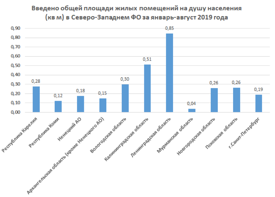 В остальных регионах ввод жилья на душу населения ниже среднего показателя в СЗФО. Например, в Мурманской области введено 0,04 кв. метров на душу населения, Республике Коми – 0,12, Архангельской области (без Ненецкого АО) - 0,15, Ненецком АО – 0,18, городе Санкт-Петербург – 0,19 кв. метров на человека.