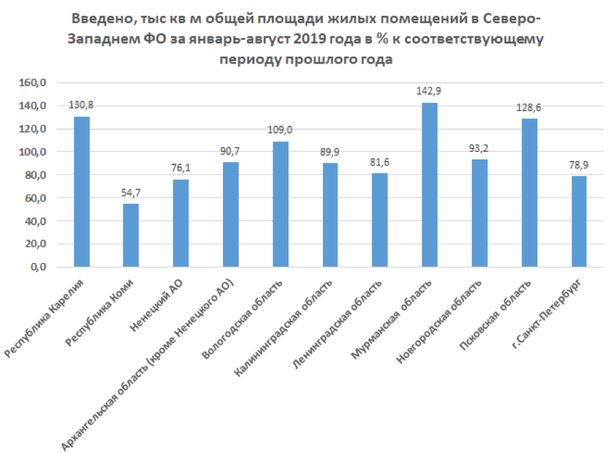В Мурманской области объемы ввода жилья, по сравнению с аналогичным результатом 2018 года, увеличились на 42,9%, Республике Карелия - на 30,8%, Псковской области – на 28,6%, Вологодской области – на 9,0%.