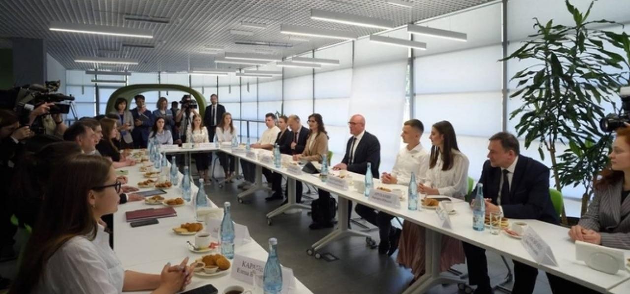 На встрече Дмитрий Чернышенко обсудил с молодыми учёными и студентами правительственные меры поддержки исследователей, создание молодёжных лабораторий, а также развитие студенческого предпринимательства и проект по созданию передовых инженерных школ.