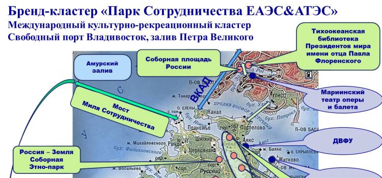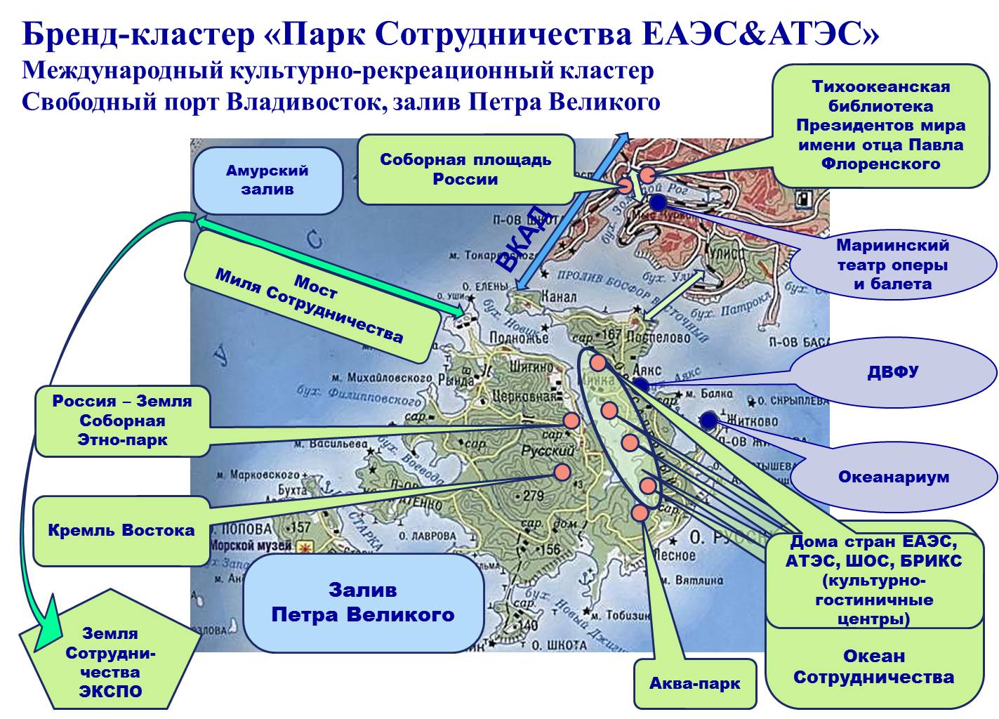 Преамбула общественной инициативы России понадобилось практически сто лет, чтобы от идей мировой революции (1917) и диктатуры либерального индивидуализма (1991) вновь встать на путь организации широкого культурного, социального, экономического и политического сотрудничества многих народов. Тот самый путь, когда политика государства соответствует доброте и щедрости русского мировоззрения: собирание всего лучшего и возращение с торицей этого синтеза другим народам. Это соборное качество, которым Россия всегда выходила из смутных времён на новый уровень развития, в современных условиях как никогда раньше востребовано уже в мировом масштабе. Именно принцип соборности – «Собирая лучшее!» – является фундаментом Евразийского экономического союза, ставшего дальнейшим развитием ШОС, БРИКС и объединившего более 50 государств. Соборность – это единение людей, с любовью к делам своим и друг к другу, осуществляющих общий для них одухотворённый образ будущего. Система новой международной архитектуры разработана и согласована на уровне международных комиссий и правительств стран – участниц ЕАЭС. Пора переходить от осознания «наверху» к практике «на земле». Пришло время «собирать камни» – сделать соборный дух России реальным достоянием сотрудничества 5 млрд человек. Предлагаемый Концепт-эскиз кластера «Парк Сотрудничества» – это реализация новых стандартов международного сотрудничества. Это формирование в заливе Петра Великого бренд-образа сотрудничества ЕАЭС и АТЭС, воплощая новую мировую архитектуру в бизнес-проекты взаимного культурного, социального, экономического и политического развития народов мира. С одной стороны, туристический кластер позволяет в формате glocal (от слов global и local) на взаимодействии локальной инфраструктуры сформировать среду глобального обитания. С другой, туризм, как форма народной дипломатии, обеспечивает широкое распространение соборного принципа сотрудничества в разные уголки мира. Международный ЭКСПО (бизнес-туризм) в единстве с культурно-рекреационной инфраструктурой – дополнительное подтверждение того, что любая экономика – это воплощение культурного своеобразия народа. Основа любой цивилизации – система накопления знаний. Инфраструктурно – это библиотека. Мировая сеть библиотек Президентов мира – это гуманитарный интегратор даже не организации, а цивилизации ЕАЭС. Перешагивая через границы стран и военных блоков, обеспечивая безопасные условия развития человеческого капитала своих народов. Преобразование именно Русского острова в бренд-остров ЕАЭС и АТЕС, ШОС и БРИКС раскрытие здесь образов стран-участниц – лучшее олицетворение созидательного потенциала новой мировой архитектуры. Одновременно и место подготовки кадров, способных на принципах ЕАЭС разрабатывать программы развития и воплощать инфраструктурные проекты общественного и государственно-частного партнёрства в любом регионе мира. Буду рад услышать ваше мнение по актуальности инфраструктурного воплощения принципов ЕАЭС в сотрудничетсве с народами мира в заливе Петра Великого. С уважением, Витрук Герман, тел. +7-914-791-1225