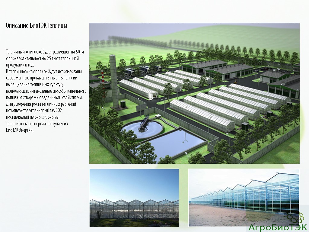Будет введено в эксплуатацию 50 га тепличных площадей при производительности 25 тыс.тонн продукции в год. Поставщиком высокотехнологического тепличного комплекса, отобранного инициаторами проекта, будет компания Агрисовгаз дочерняя компания ОАО Газпром. Компания Агрисовгаз созданная в 1990 г. укомплектована технологическим оборудованием известных Европейских компаний и использует передовые технологии в производстве тепличных комплексов. По предложенным качеству изготовления тепличных конструкций, цене и оказываемому сервису во время эксплуатации теплиц, компания Агрисовгаз превосходит своих зарубежных и российских конкурентов.