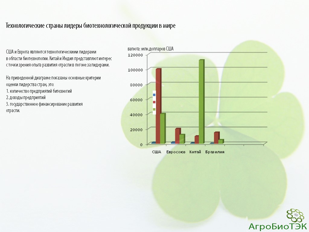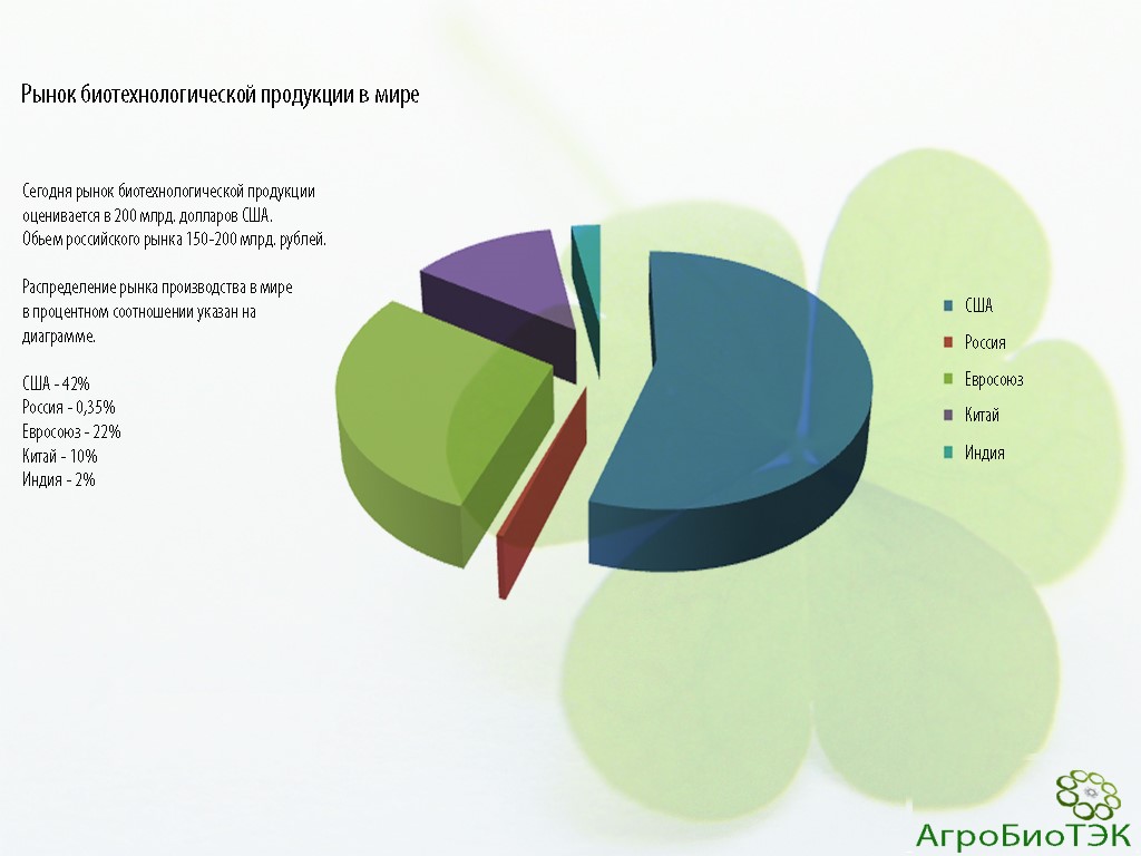 Сегодня мировой рынок биотехнологической продукции оценивается в 200 млрд. долл. США, а объем российского рынка – 150 – 200 млрд. руб. (около 3.5% от мирового). При этом объем производства биотехнологических продуктов в России – не более 20 млрд. руб. (менее 0.35% от мирового). Для сравнения: доля США оценивается в 42%, ЕС – 22%, Китая – 10%, Индии – 2%.