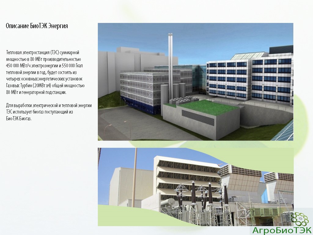 - Тепловая Электростанция (ТЭС) (БиоТЭК Энергия) мощностью 80 МВт и производительностью 450 млн.кВт/ч электроэнергии в год с выработкой в когенерационном режиме 550 тыс.Гкал тепловой энергии. ТЭС будет оснащен четырьмя Газотурбинными установками единичной мощностью 20 МВт.