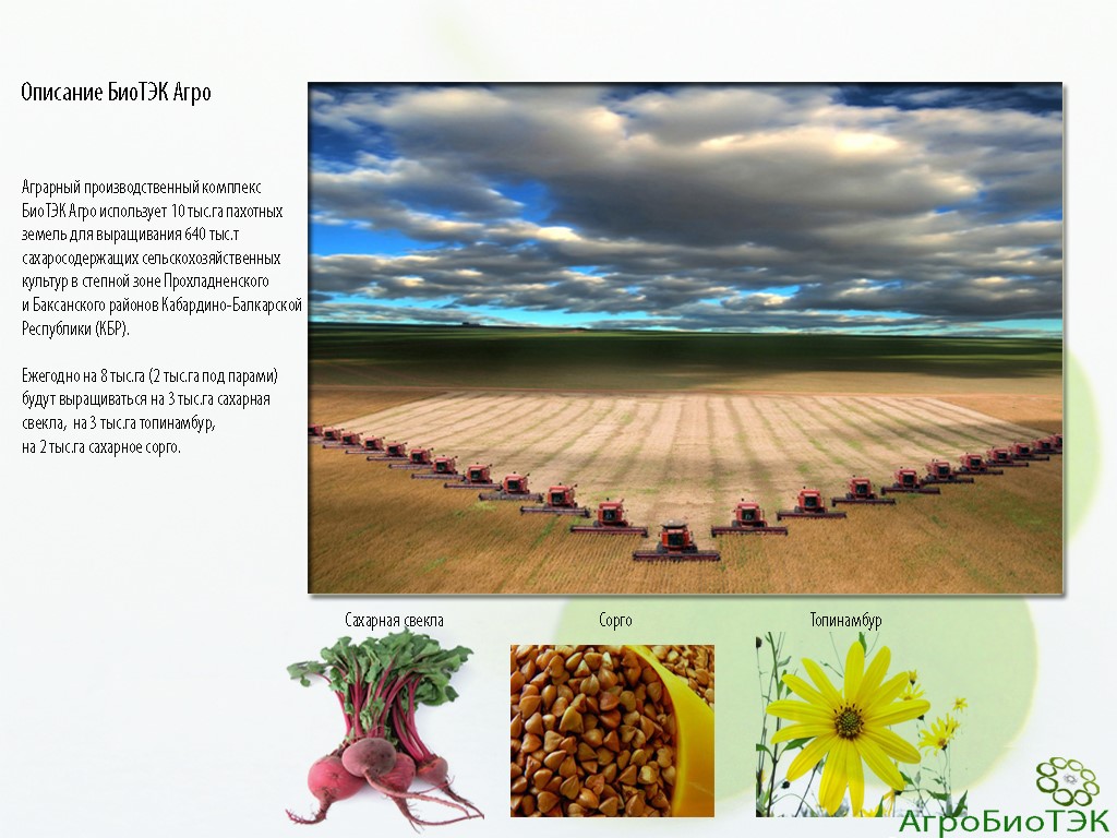 - При выращивании сельскохозяйственных технических сахаросодержащих растений будет использоваться высокопродуктивный семенной материал, обработка почвы будет производиться биоорганическими удобрениями, сбор урожая будет производиться высокопроизводительными европейскими сельхоз машинами, минимизурующими потери при сборе урожая.