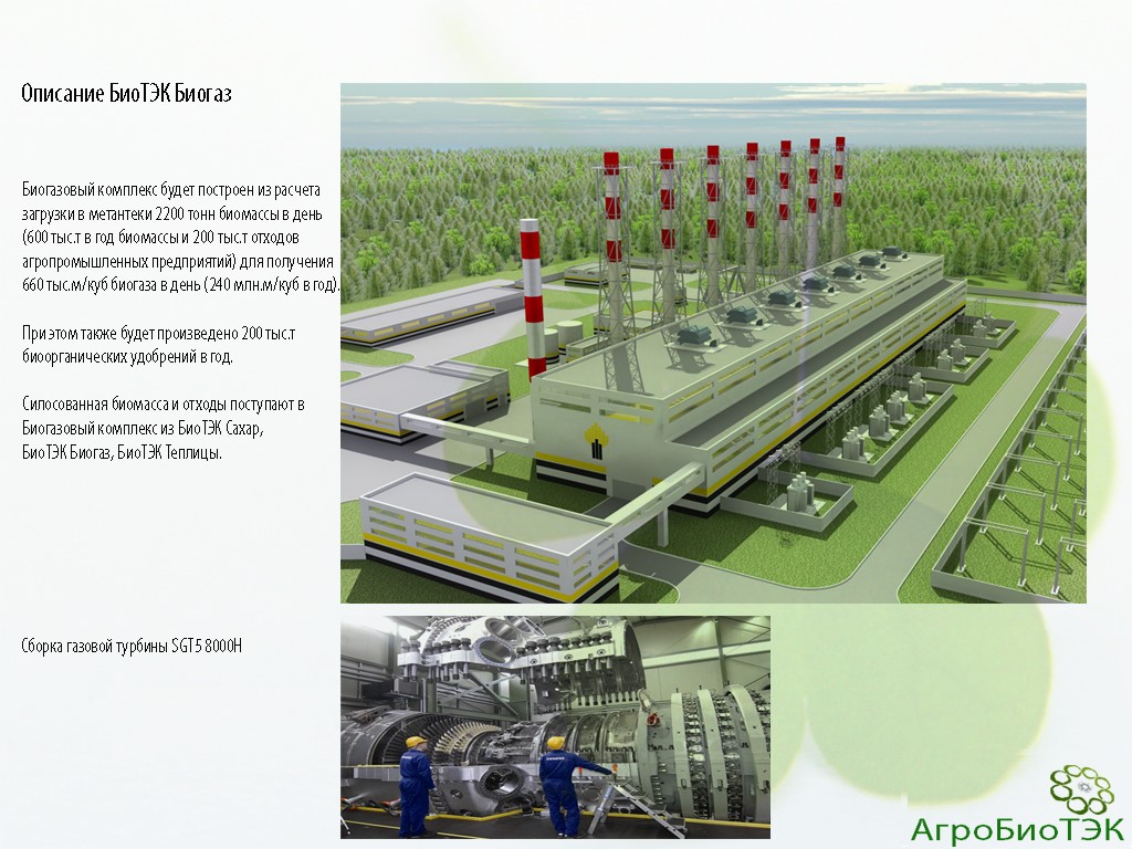 Биогазовый комплекс будет построен из расчета загрузки в метантанки 2200 тонн биомассы в день (600 тыс.т в год биомассы и 200 тыс.т отходов агропромышленных предприятий) для получения 660 тыс.м/куб биогаза в день (240 млн.м/куб в год). При этом также будет произведено 200 тыс.тонн биоорганических удобрений в год. Жидкая часть стоков биогазового брожения будет поступать в открытые резервуары по выращиванию водорослей. Технологический процесс получения биогаза из органической биомассы отработан различными европейскими компаниями, а также российскими производителями отраслевого оборудования. Биогазовый комплекс будет укомплектован современными технологическими системами имеющими промышленное использование.
