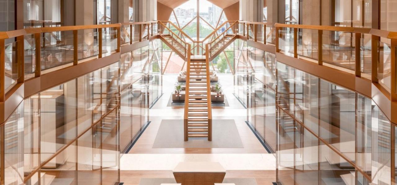 В итоге в здании получилось шесть двухэтажных рабочих пространств с двусветным атриумом по центру, что задает всей штаб-квартире масштаб и размах и позволяет максимально использовать дневное освещение. Объединяет этажи Y-образная лестница, похожая по форме на логотип РМК.