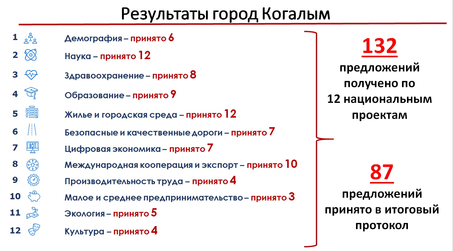 В результате участниками форсайт-сессии было выработано 132 предложений по 12 национальным проектам. В итоговой протокол организаторами мероприятия - управление экономики Администрации города Когалыма, внесено 87 предложений.