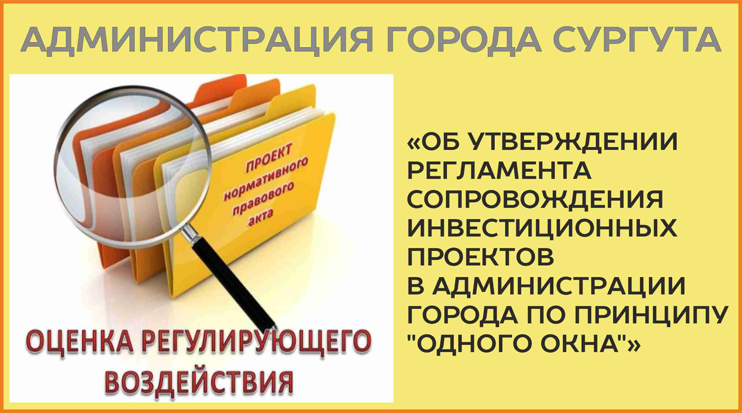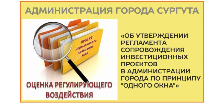 Администрация города уведомляет о проведении публичной консультации в целях проведения оценки регулирующего воздействия проекта постановления Администрации города Сургута «О внесении изменения в постановление Администрации города от 20.09.2016 г. №7009 «Об утверждении регламента сопровождения инвестиционных проектов в Администрации города по принципу "одного окна"».
