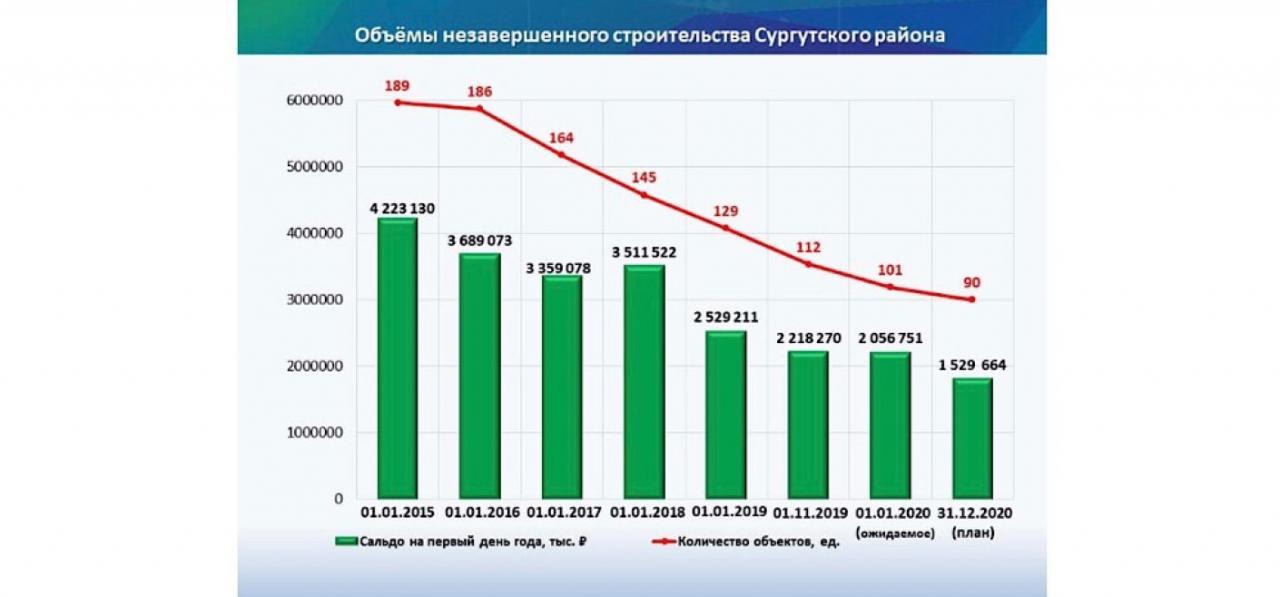 Всю работу строго планируем. В т.ч. по вводу «незавершенки» на 2020 год план на сумму 1,223 млрд. рублей (22 объекта). Из них наиболее крупные: спортивно-досуговый комплекс п.г.т. Белый Яр. 2 очередь. Культурно-досуговый центр (516 млн. рублей); реконструкция автомобильных дорог для организации автобусного движения в пгт.Белый Яр (330 млн. рублей).